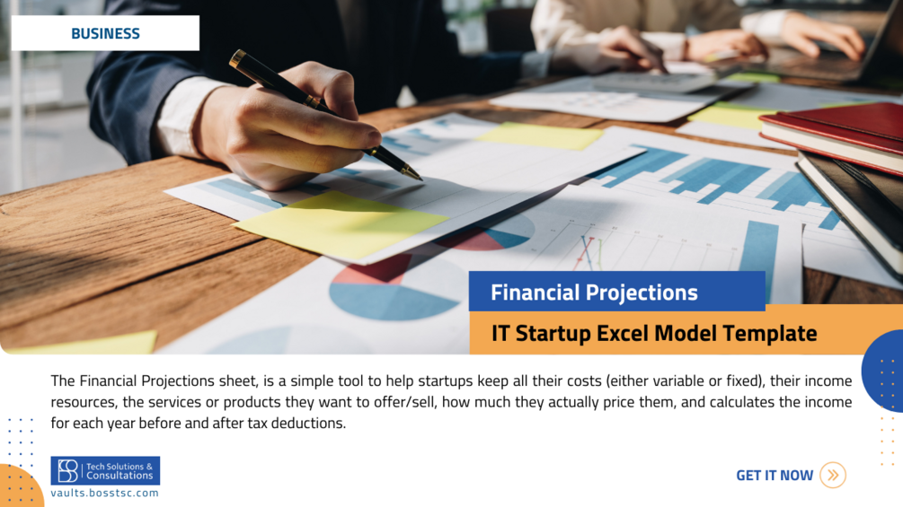 The Financial Projections sheet, is a simple tool to help startups keep all their costs (either variable or fixed), their income resources, the services or products they want to offer/sell, how much they actually price them, and calculates the income for each year before and after tax deductions.